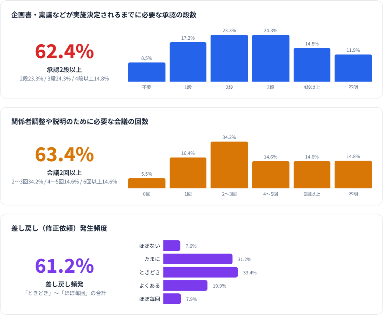 「承認が2段以上必要」「会議が2回以上行われる」「差し戻し常態化している」がいずれも6割超。約9割が過去の意思決定根拠を探しても見つからなかった経験があることが明らかに。