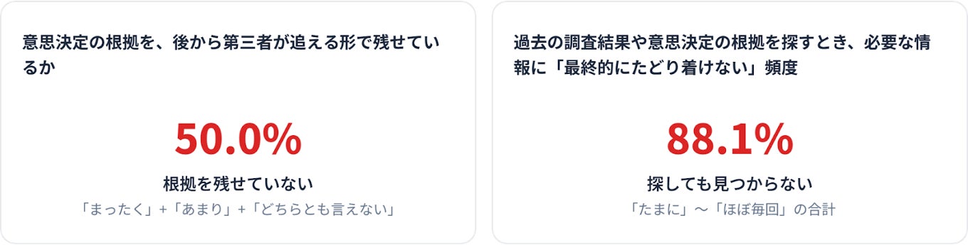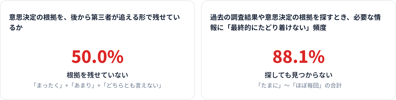 調査結果や意思決定の根拠(出典・議論の経緯)を後から第三者が追える形で残せていない組織は50.0%でした。また過去の根拠情報を探しても最終的にたどり着けないことがある(「たまにある」〜「ほぼ毎回ある」)と回答した割合は88.1%にのぼっています。