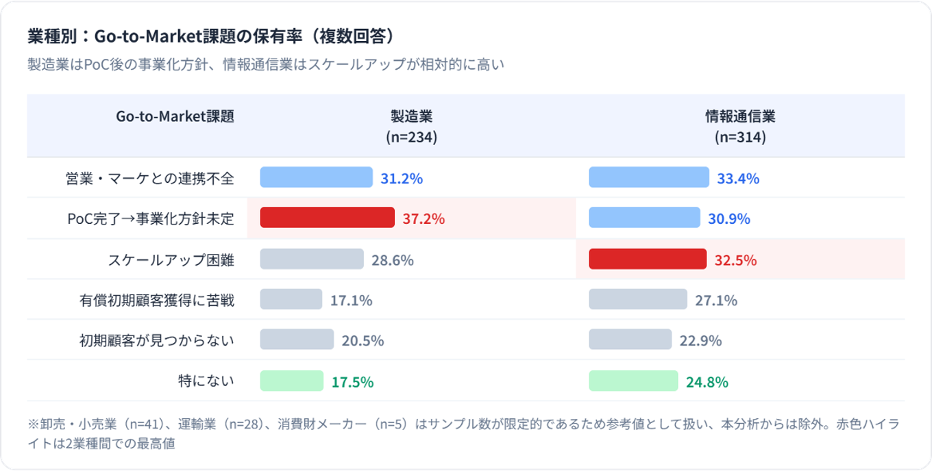 業種別のクロス分析の結果、新規事業開発担当者が直面するGo-to-Market課題の構造は、業種ごとに異なることも確認されました。