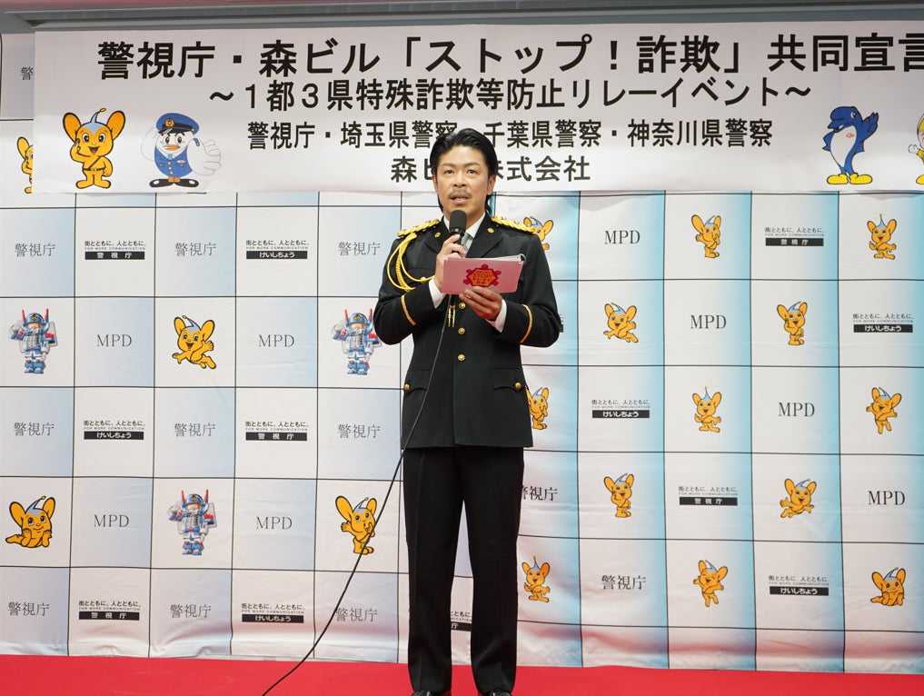 首都圏で多発する特殊詐欺等被害を受けて、管轄を超えた連携により各種対策を推進するため、1都3県(東京都・埼玉県・神奈川県及び千葉県)各警察において、リレー形式で広報啓発活動を企画し、東京都では、松本利夫特別防犯支援官が警視庁本部で行われた警視庁・森ビルの「ストップ!詐欺」共同宣言に参加し、最近被害が拡大している「警察官をかたる詐欺」への注意を呼びかけました。
