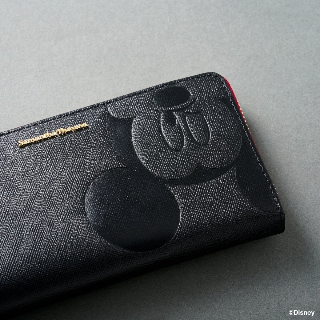 「ミッキー」がこちらを覗いている様子をデザインした、遊び心溢れるアートが型押しに施された小物シリーズ。