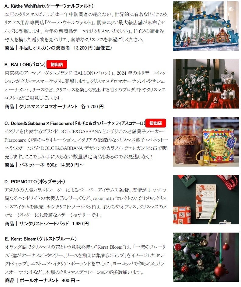 物販店では、ドイツに本店を構えるクリスマス用品専門店「ケーテ・ウォルファルト」をはじめ、ドルチェ&ガッバーナデザインのクリスマス菓子パネットーネ、トロンチーニを限定販売する「ドルチェ&ガッバーナ×フィアスコナーロ」やクリスマスのアロマプロダクトの「バロン」などクリスマス雑貨を扱う5店舗が出店。飲食店では、三國清三氏が監修する「ダイニング 33」が、フランスの伝統料理ポトフーを提供するほか、本場イタリア料理を展開する「フィオルディマーゾ&クランデスティーノ41」はチーズフォンデュ、ドイツ人シェフが手掛ける「ジャーマン クリスマス スタンド」では焼きたてプレッツェルやソーセージを提供するなど、12店舗が麻布台ヒルズのクリスマスマーケットでしか味わえない様々な国の本格的なクリスマスグルメをご用意します。