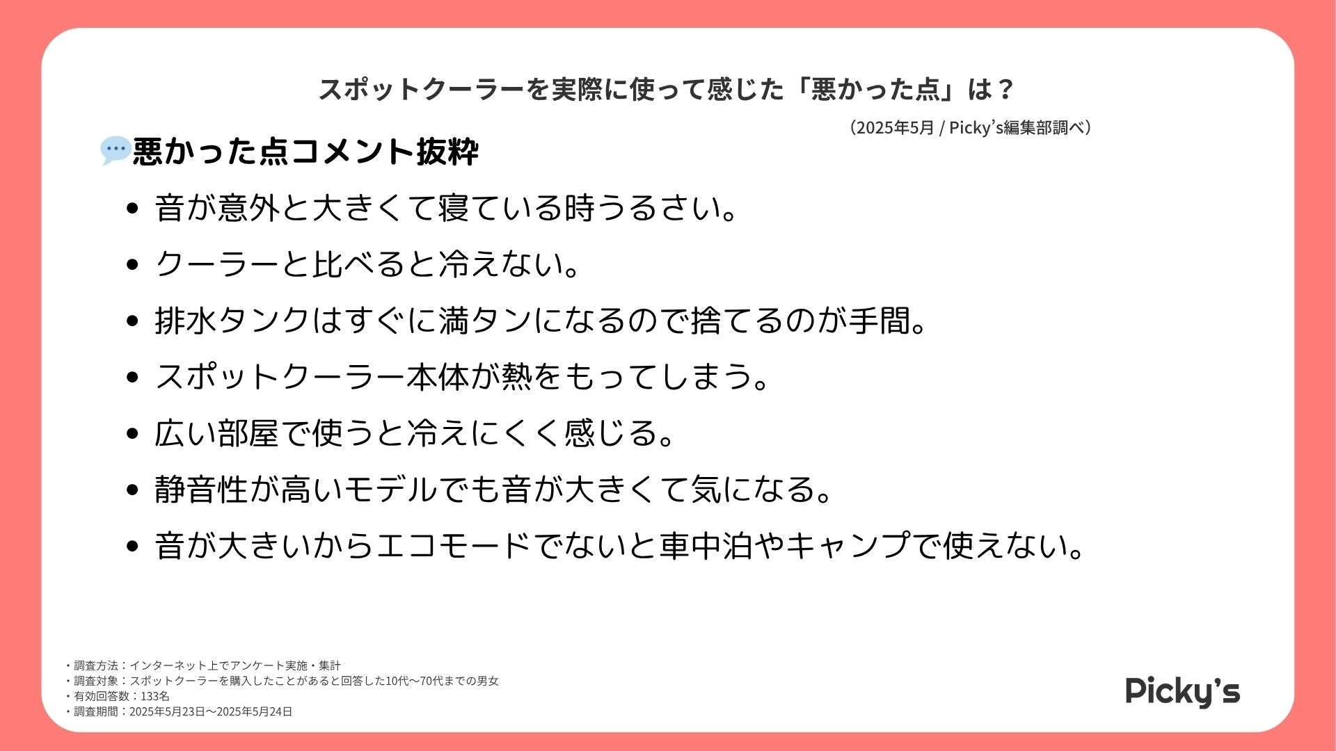 スポットクーラーを実際に使ったユーザーからは、「音の大きさ」に対する不満が最も多く挙げられました。