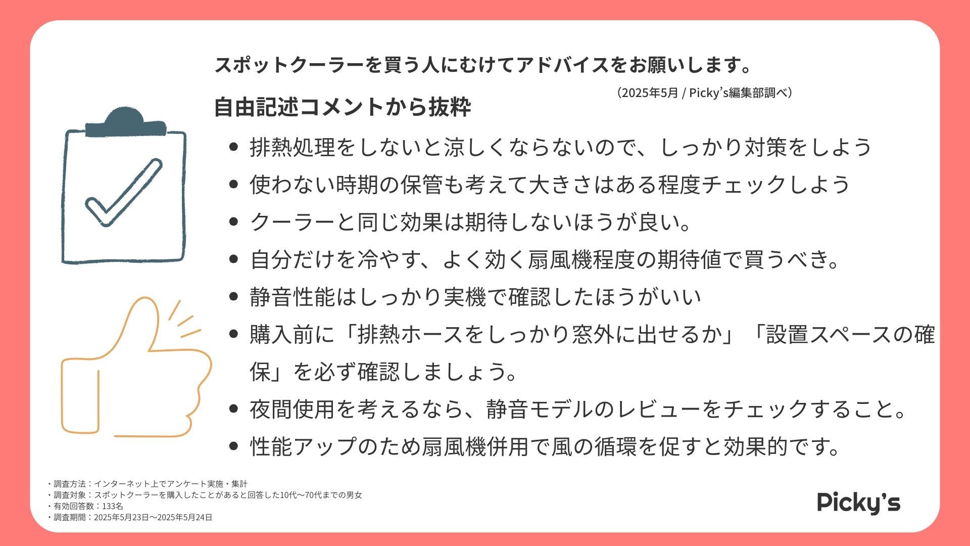 今回の調査を通じて、スポットクーラー選びでは「価格の手頃さ」だけでなく、「排熱・排水の対策がしやすいか」「使用場所に合っているか」といった総合的な使い勝手が満足度を左右することが明らかになりました。