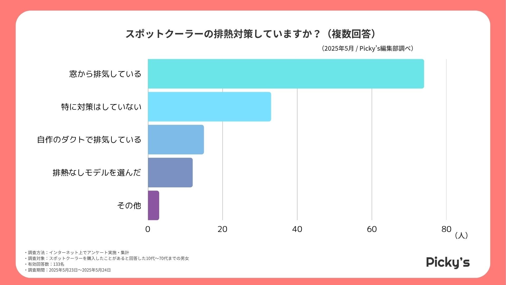 スポットクーラー利用者の排熱対策としてもっとも多かったのは「窓から排気している」(74件)で、設計上の推奨に従うユーザーが多数を占めました。