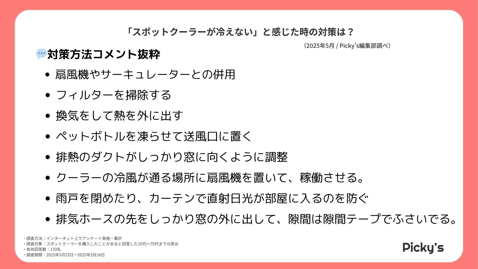 このたびPicky’s(https://picky-s.jp/)およびPicky’s Life(https://pickys-life.jp/)では、インターネット上でスポットクーラーに関するアンケート調査を実施し、その結果を発表します。