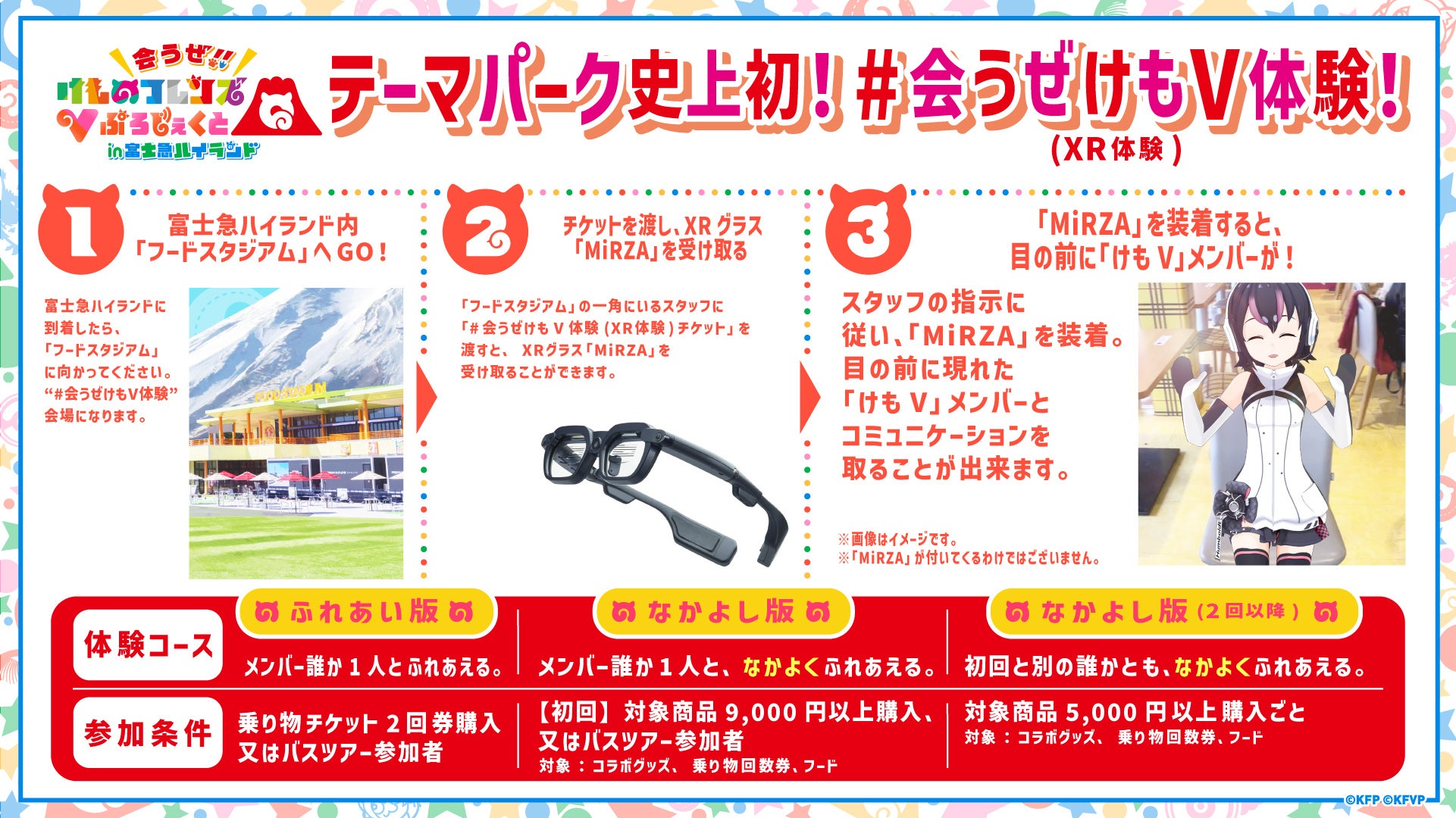 コラボでは、株式会社NTTコノキューデバイス(以下、コノキューデバイス)が開発し、コノキューが販売するXRグラス「MiRZA®(ミルザ)」を装着すると、「けもV」メンバーとコミュニケーションが取れる、「XR体験」や、豪華特典がついた新宿-富士急ハイランド間のバスツアープランを3月28日(金)正午より販売予定です。