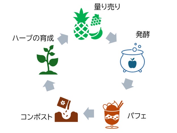 「①フルーツを量り売り」し、期限の迫ったモノは「②発酵」の力で期限を延ばし、、「③パフェ」などに利用。バナナの皮などの不可食部は、乾燥して地元・下北沢の「シモキタ園芸部」でコンポスト(たい肥化)。たい肥で育てた「⑤ハーブ」を収穫し、また店舗で提供しています。