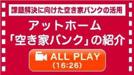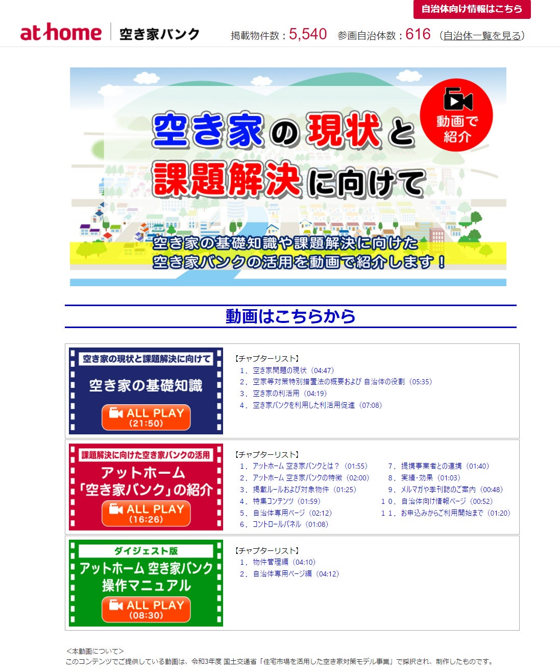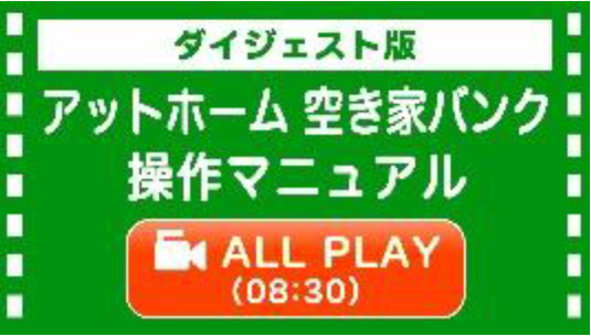 本事業に採択され、自治体支援企画として、空き家対策担当者向けに「空き家対策関連動画」のコンテンツの提供を開始いたしました。空き家の現状と課題解決に向けて、「空き家の基礎知識」の習得や「アットホーム 空き家バンクの紹介」、「アットホーム 空き家バンク操作マニュアル<ダイジェスト版>」などを動画にて紹介しております。