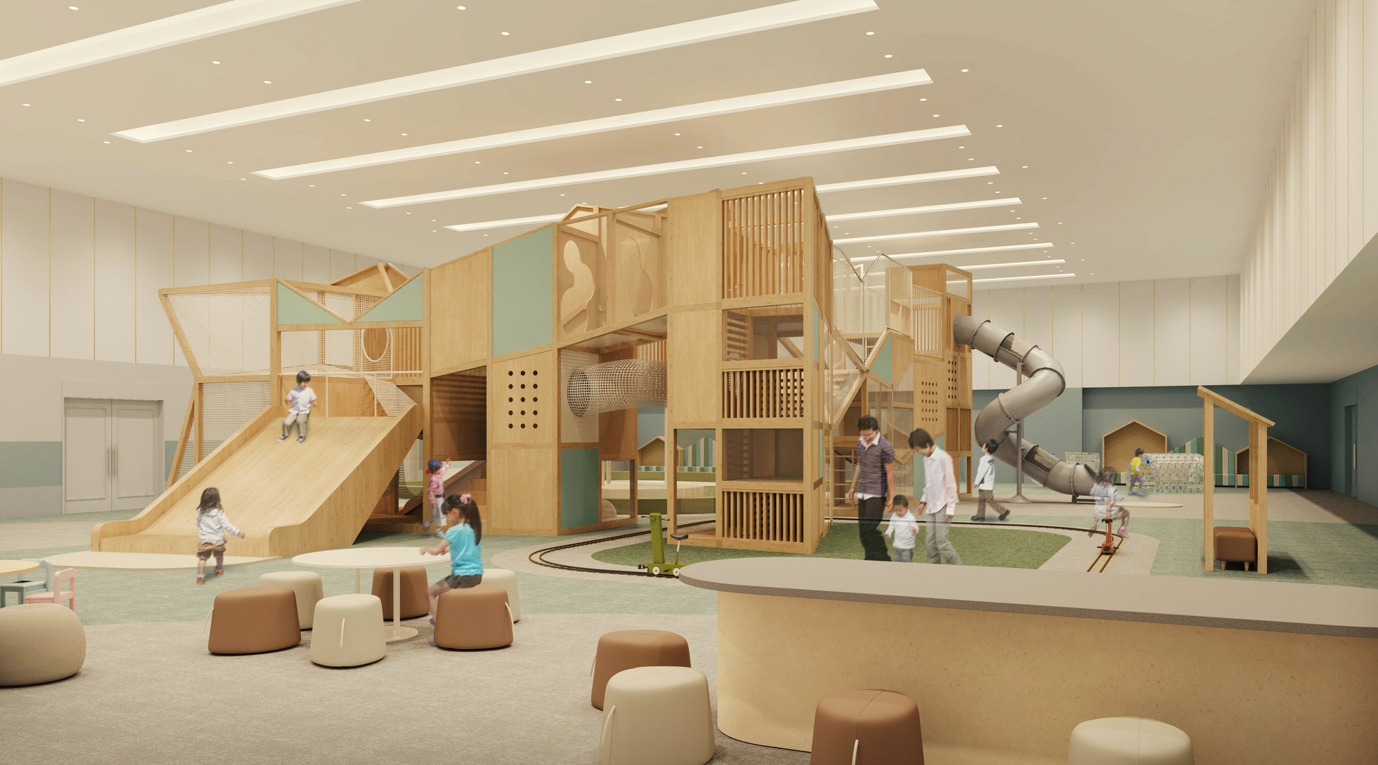 「杜の8」は約1,400㎡の広さに、3つのエリアがあり、子どもの年齢に合わせて楽しめるアクティビティを用意。そのうち1つのエリアの真ん中には、八ヶ岳のようにそびえる全長約5mの遊具があり、山登りをするような感覚で一番上まで登ったり、滑り台で降りてきたり無我夢中で遊ぶことができます。