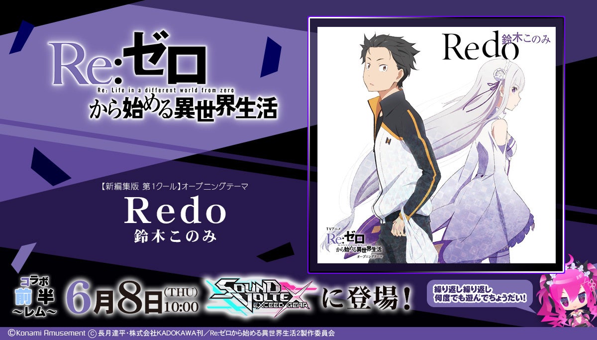 今回のコラボでは、TVアニメ「Re:ゼロから始める異世界生活」の【新編集版 第1クール】オープニングテーマ「Redo」が『SOUND VOLTEX EXCEED GEAR』に収録され、6月8日(木)から、プレー可能となります。