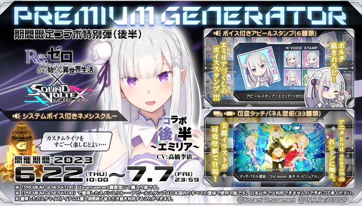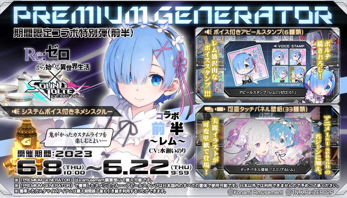 「Re:ゼロから始める異世界生活」と『SOUND VOLTEX EXCEED GEAR』のコラボを記念し、楽曲、限定アイテムが登場します!