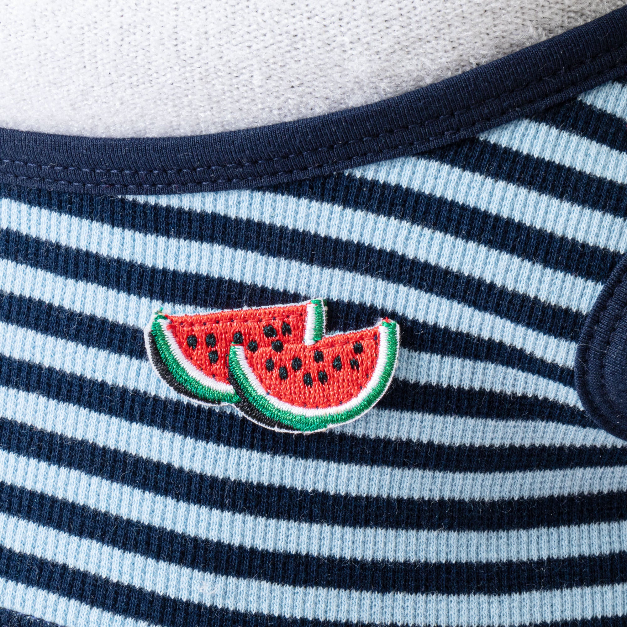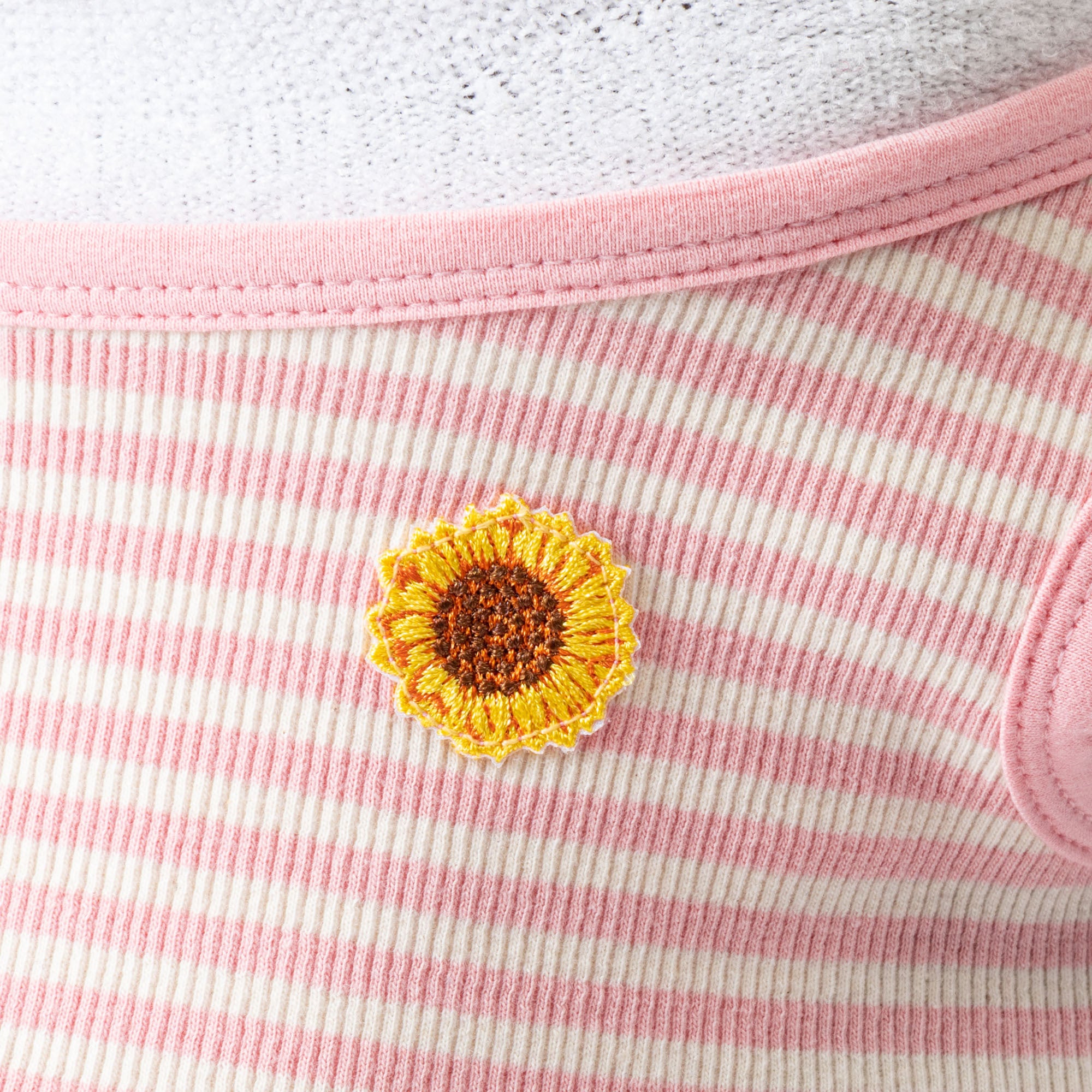 夏らしい配色のボーダー生地を使って製作したタンクトップは、それぞれのカラーに付いたスイカ、ひまわりのオリジナルワッペン刺繍がデザインポイント。セットで付いている麦わら帽子は、ゴム仕様のため取り付けがとても簡単です。他のアイテムと組み合わせれば一気にサマースタイルに。コーディネートの幅が広がる、お得で楽しいセットです。