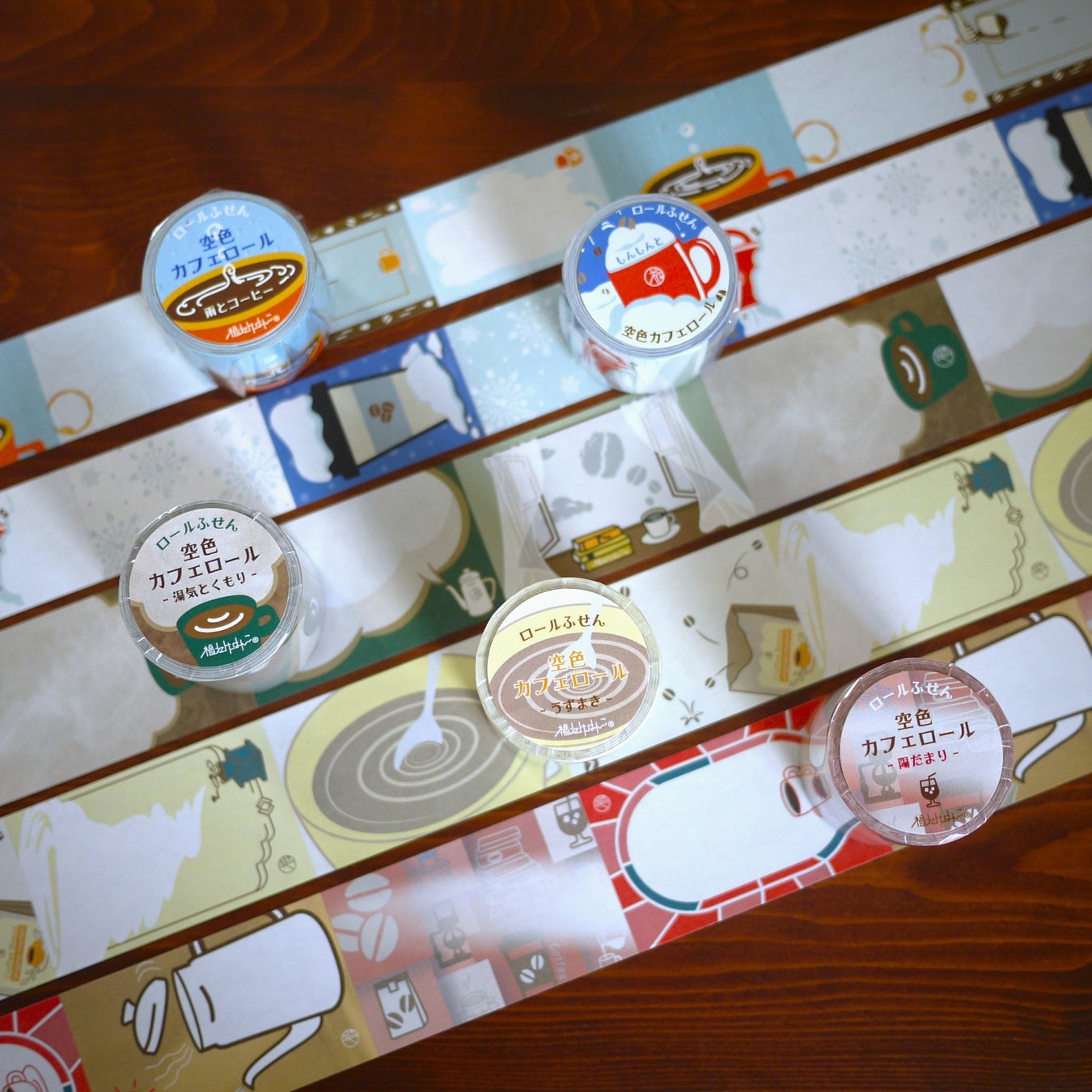 カフェ×天気がテーマのロールふせん5本セット。晴れ・曇り・雨・雪・風の5つの空模様をモチーフにしたデザインです。このロールふせんで手帳をデコレーションすれば、どんなお天気の日も特別な1日に♪ オリジナル缶入りで、使用後は小物入れとしても楽しめます。
