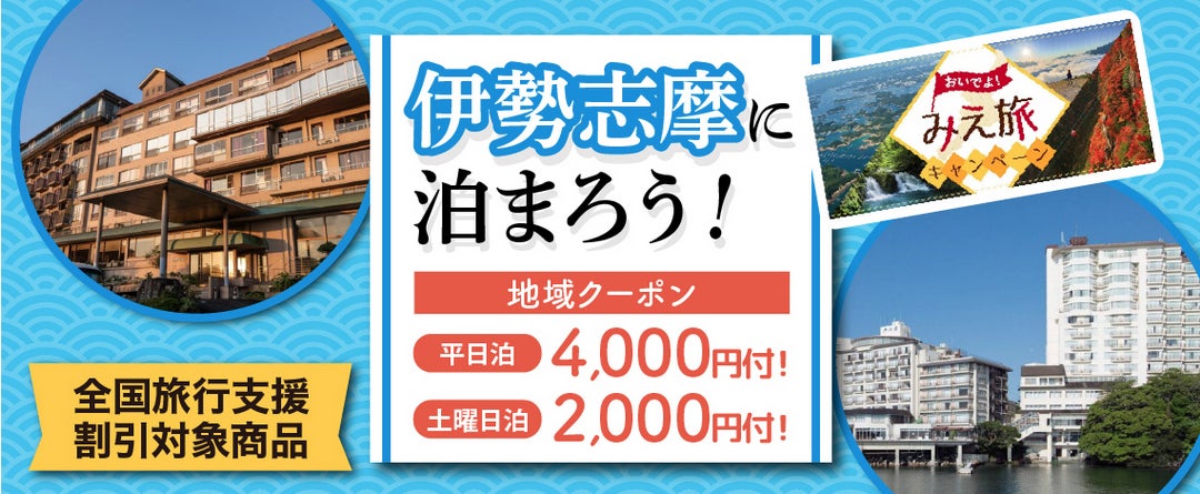 クーポン最大4000円付!3/24迄の限定商品 【伊勢志摩鳥羽】に行こう!! 三重県の全国旅行支援「おいでよ!みえ旅キャンペーン」を利用【伊勢志摩鳥羽】『朝・夕食付』宿泊プラン