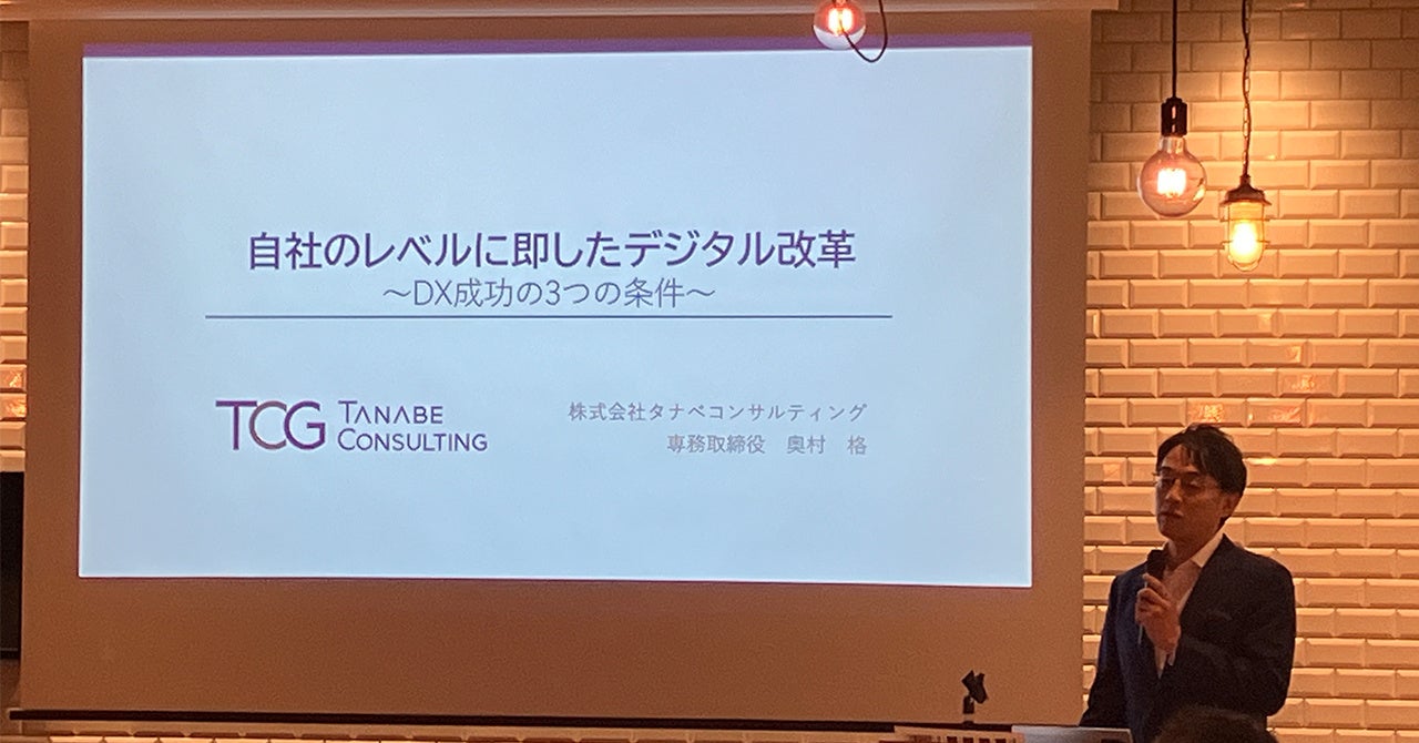 日本の経営コンサルティングのパイオニアである株式会社タナベコンサルティンググループ(本社:東京都千代田区・大阪市淀川区、代表取締役社長:若松 孝彦)は、リコージャパン株式会社が9月2日(月)および3日(火)に開催した「RICOH Digital Summit in 日本橋」に参画し、同イベント内の「企業価値向上セミナー」において、当社専務取締役 奥村 格が「自社のレベルに即したデジタル改革~DX成功の3つの条件~」をテーマに講演を行いました。