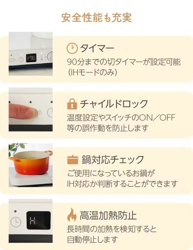 チャイルドロックや高温加熱防止、鍋対応チェック機能など、調理器としての安全性能もバッチリ備わっています。
