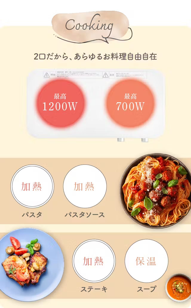 最高700W、最高1200Wにまで対応したハイパワーな2口のIHコンロを備えています。