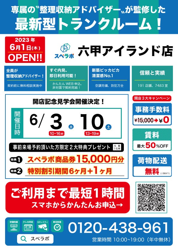 【六甲アイランド店/6月1日(木)オープン】見学から契約、解約まで完全非接触・非対面、お申し込みからご利用まで最短1時間!大阪で絶賛運営中のトランクルーム【スペラボ】がアイランドセンター駅近くに出店!