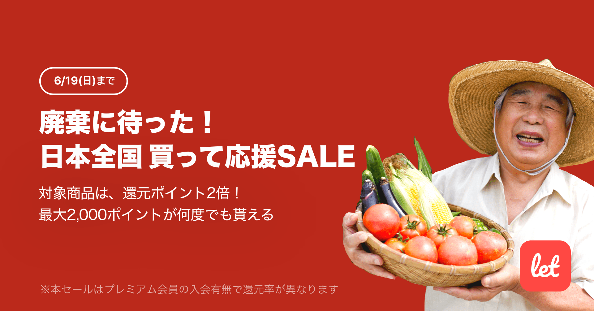 株式会社レット(本社:東京都港区、代表:佐藤 航陽)が運営する、食品ロス/在庫ロス削減のマーケット「Let(レット)」内で「廃棄に待った!日本全国 買って応援SALE」を6月17日(金) 18:00より開催します。期間中、プレミアム会員様限定で対象の食品をご購入いただくと、2,000ポイントを上限に還元ポイントが2倍になります。期間中のご購入であれば、ポイント還元はお一人様あたり何度でもご利用いただけます。