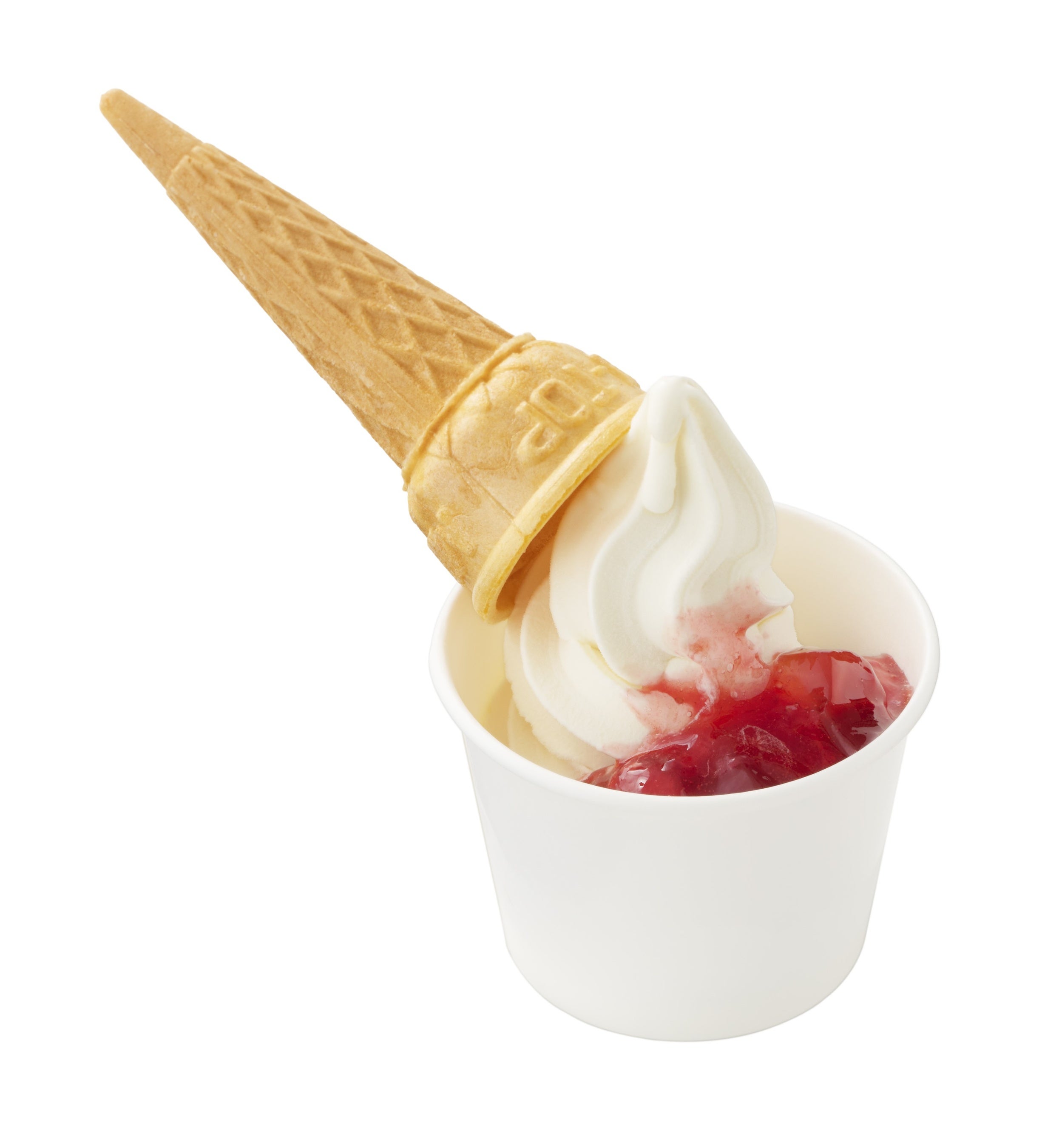 プラントベースのソフトクリームに、ストロベリーソースとストロベリーゼリーをかけたサンデー。