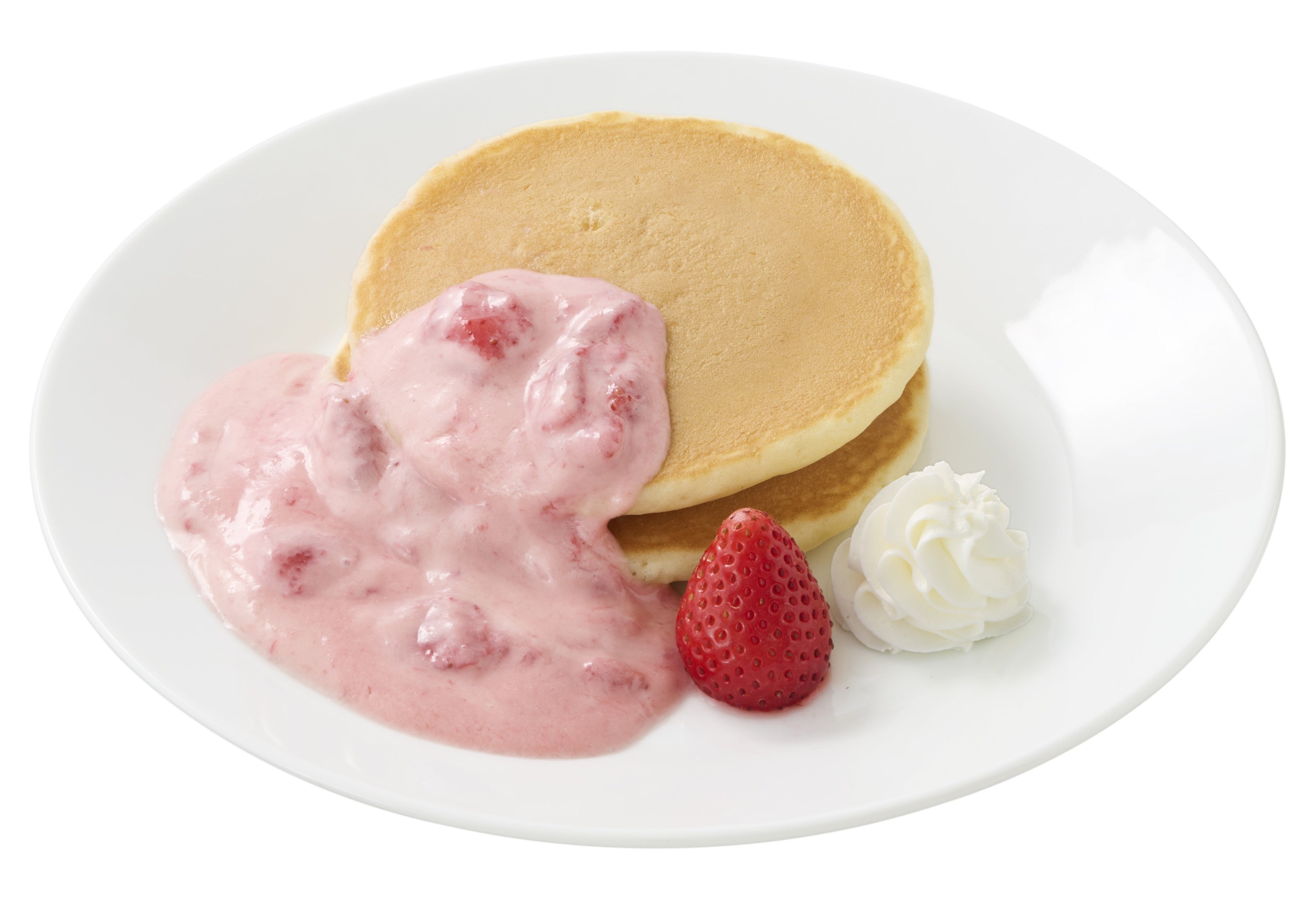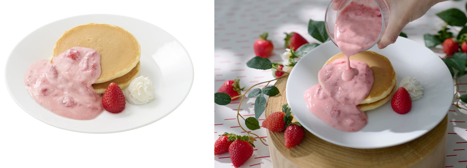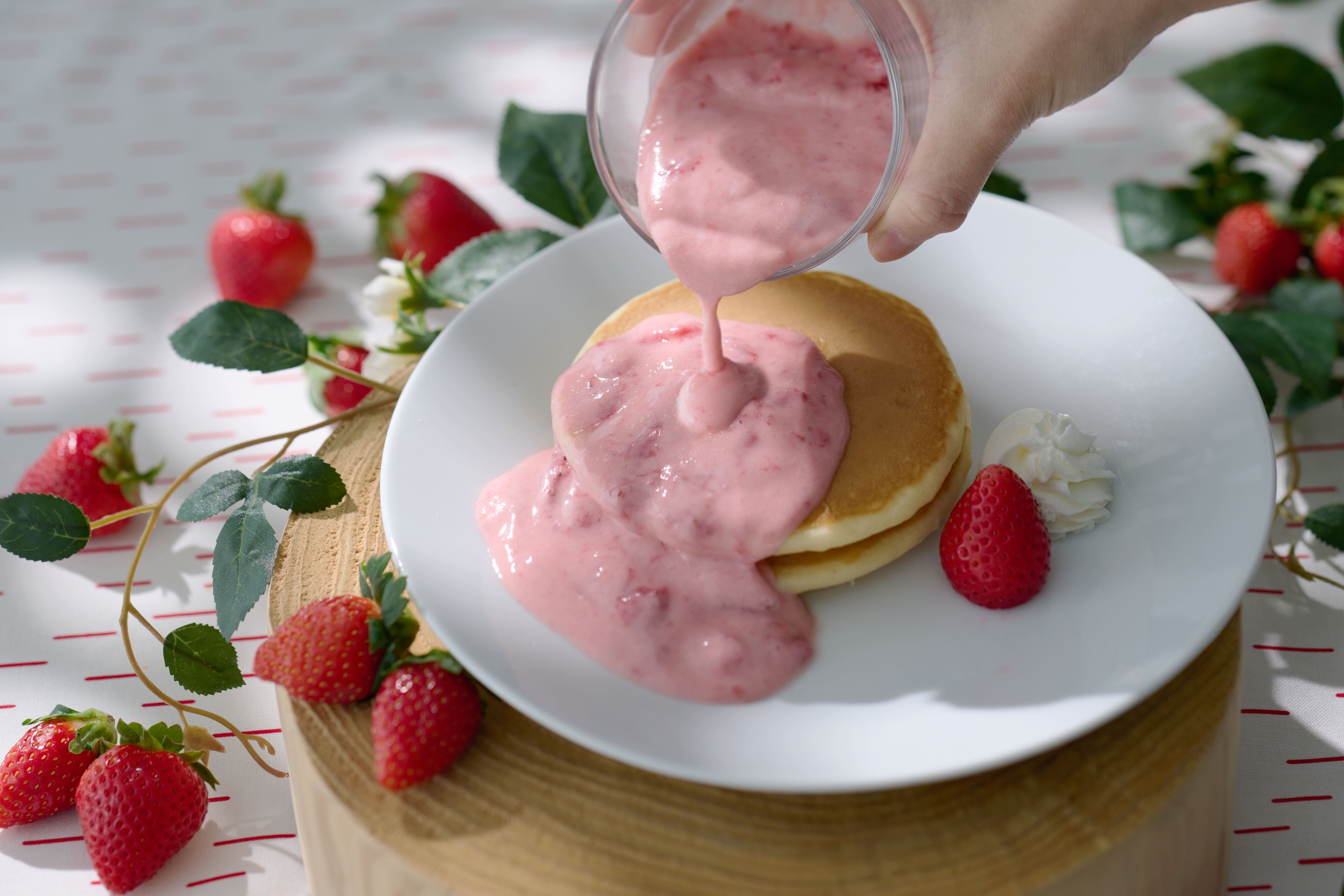 ストロベリーソースとチーズクリームソースを混ぜたスペシャルソースを、ふわふわのパンケーキに好きなだけかけて召し上がれ。