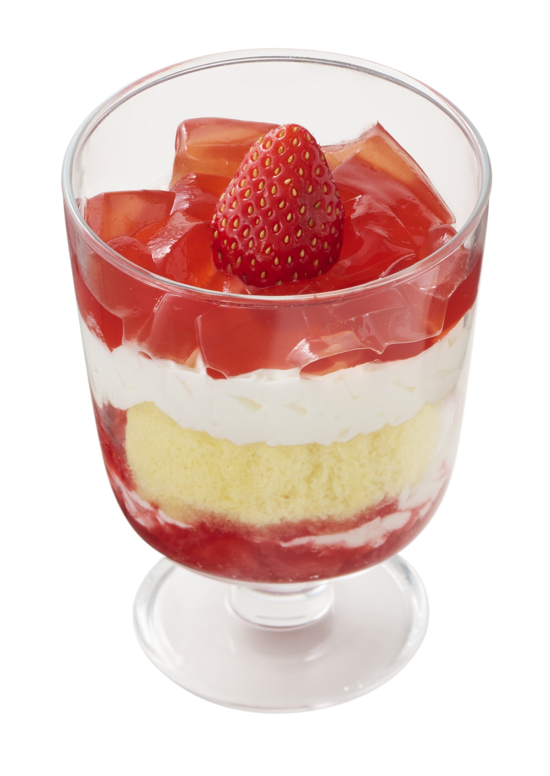 ストロベリーソースに、ホイップクリーム、ロールケーキ、ストロベリーのゼリーをのせた、とにかく満足度たっぷりの贅沢パフェ。