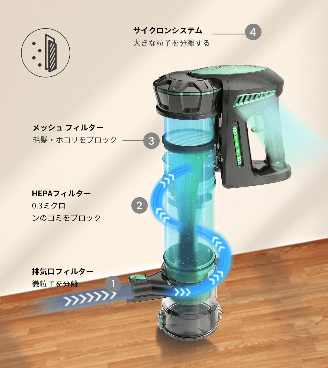 また、この掃除機は壁掛け収納ができるスティック掃除機としても使えます。さらに、HEPAフィルターや多重濾過システムも採用されているため、花粉やハウスダストなどの微小な粒子もしっかりキャッチすることができます。