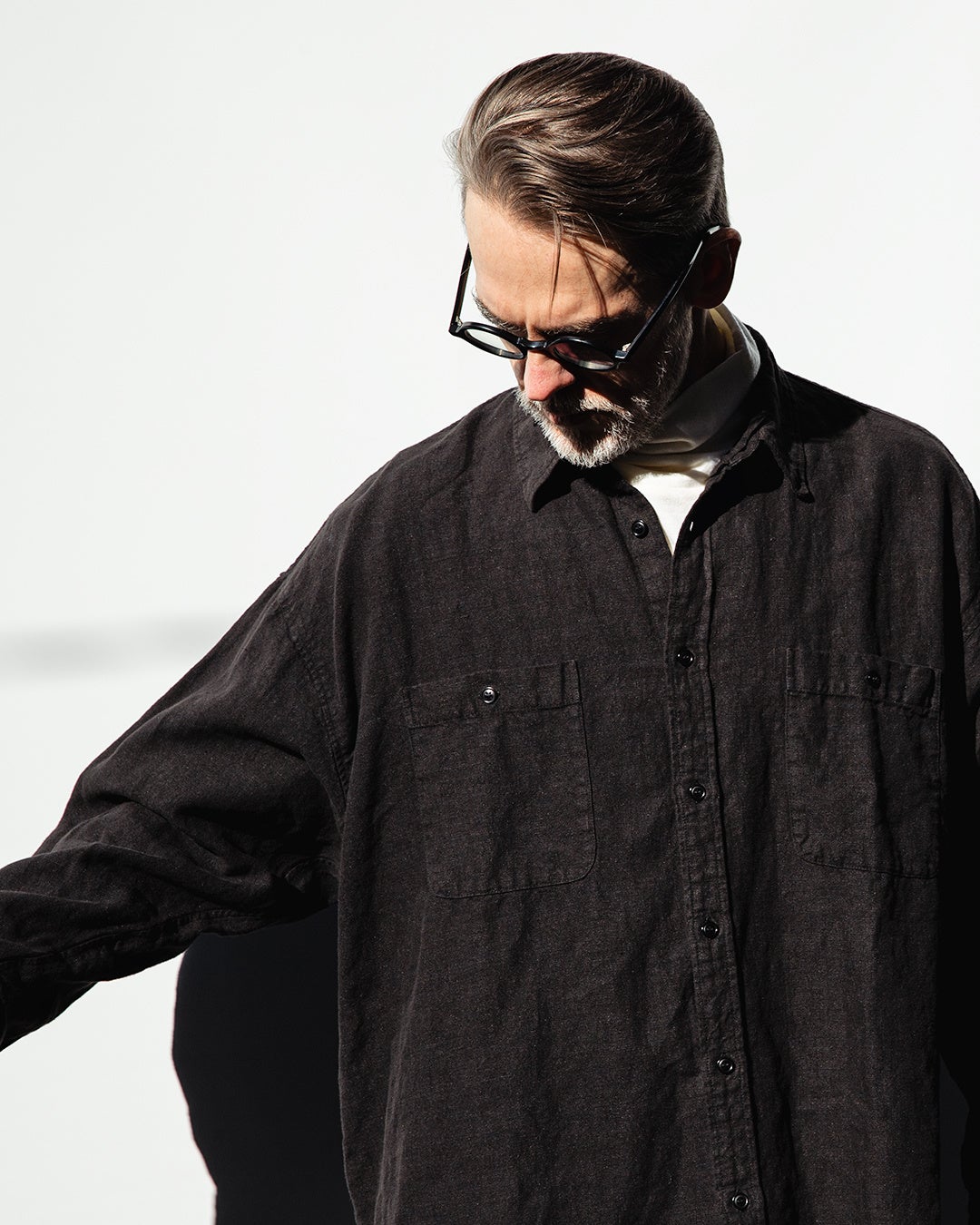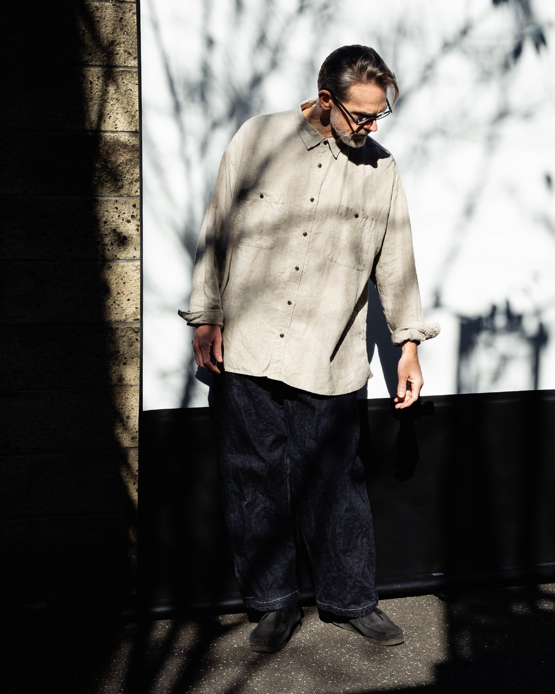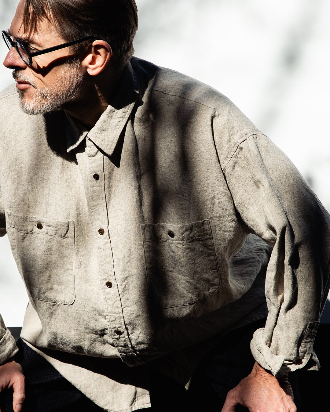 リネン生地をたっぷりと使用したワイドな身幅が特徴のバギーシャツ。2022年秋より継続するこのモデルをこの度、衿型やポケットワークにミリタリーディテールを取り入れてアップデートしました。
