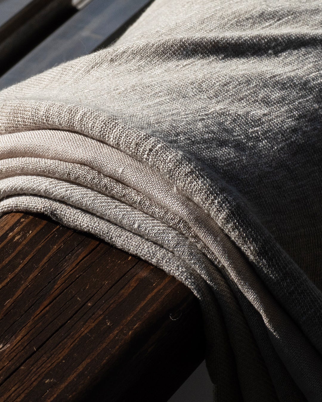 刈り取ったフラックスを畑の上で寝かせ自然乾燥を行ったリネンは、繊維が土壌の黒味を吸い上げ、繊維中の菌が繁殖する過程で色味が深まっていくことで、「黒味のあるリネン=ブラックリネン」となります。通常のリネンよりも、グレイッシュな色味が特徴です。