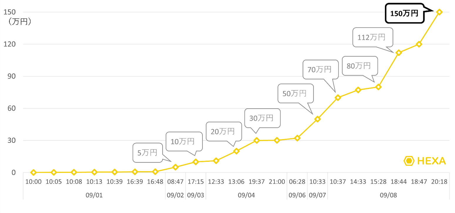 9/1(日)10:00からスタートしたオークションは初日から7件の入札がありました。その後、9/2(月)には50,000円、9/3(火)には100,000円、9/4(水)には301,001円まで値を上げました。その後、9/6(金)に321,984円の入札、9/7(土)に500,000円の入札がありました。そして、最終日9/8(日)には、合計6件の入札で盛り上がり、最終的に1,500,000円の入札でオークションが終了いたしました。