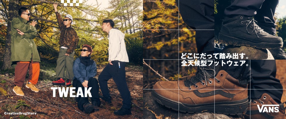 「都会と自然を繋ぐ防水モデル」のTWEAKは、撥水加工を施したヌバックレザーをアッパーに、防滑デザインのラバーアウトソールと軽量・クッション性に優れたEVAミッドソールを採用。