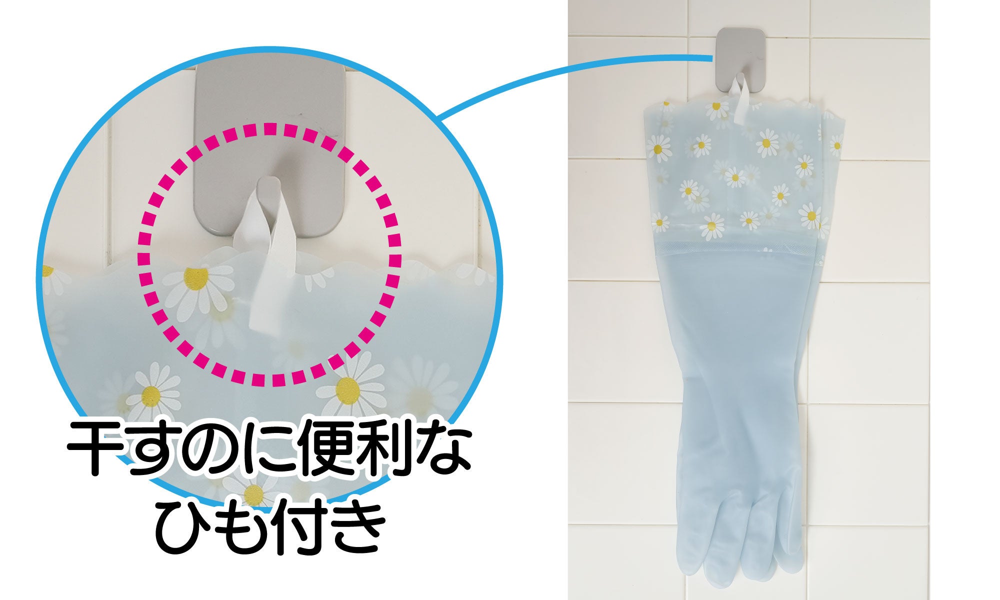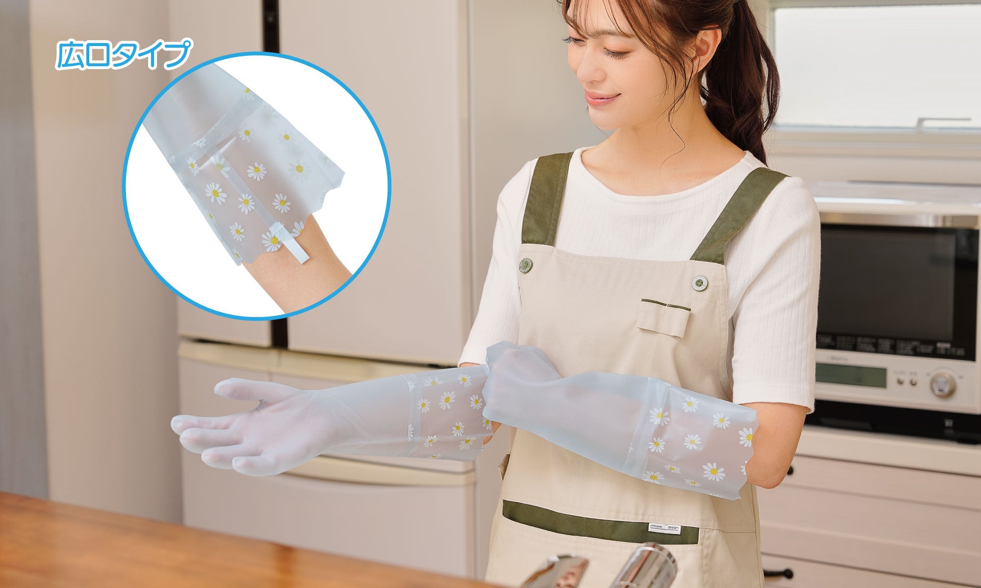 スムーズに着脱でき、ひじまですっぽり覆うロングタイプなので、水仕事中の袖口の水ぬれを防ぎます。