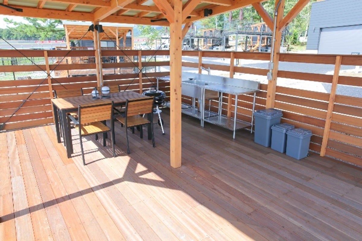 ノーリードで愛犬とキャンプが楽しめる特別なオートキャンプサイト。椅子・テーブル・キッチン(温水対応)完備のルーフデッキ仕様なので、好きなテントと愛犬と一緒に気軽にキャンプを楽しめます。100Rコースビューが望める環境で少し贅沢なキャンプを堪能いただけます。