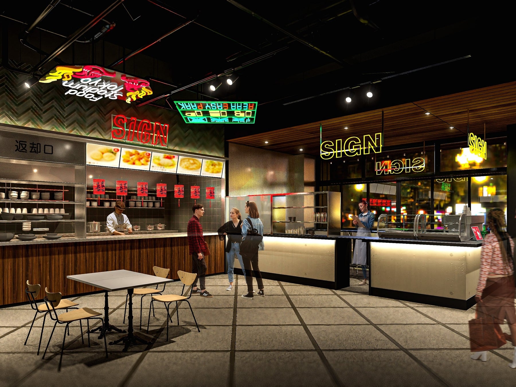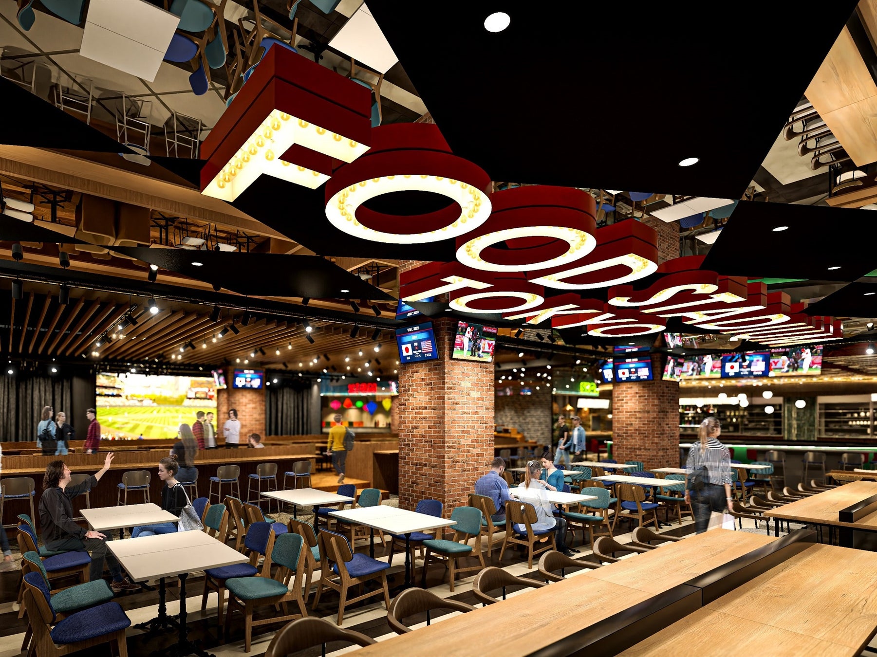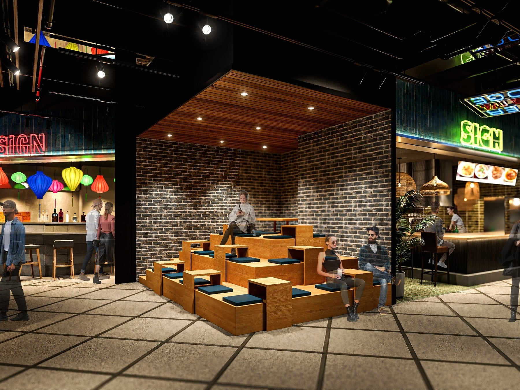 フードホール内は、照明を落としてネオンが光る、大人がお酒を楽しめる空間を演出。また、館内に設置した巨大LEDビジョンと大小多数のモニターでは、スポーツやエンタメコンテンツを放映します。エンターテインメントシティならではの臨場感、わくわく感を感じながら、様々な客席を自由に選べるスタイルで、11店舗の多種多様なグルメを提供します。