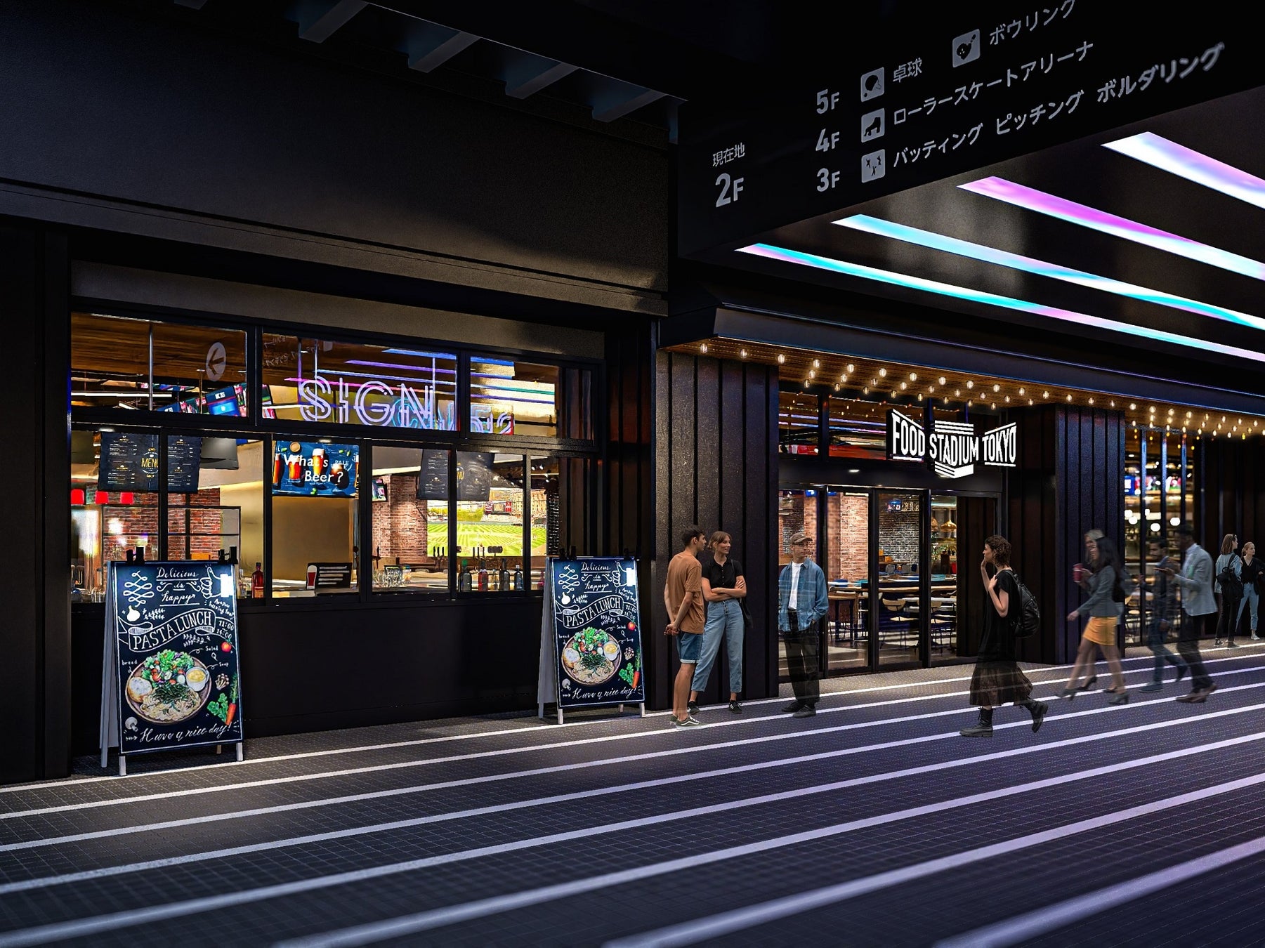 ◎施設名称について:東京の真ん中に位置し、スタジアムの雰囲気を感じられる空間の中で、巨大LEDビジョンやモニターに囲まれながら、多種多様なグルメを楽しめる場所という意味を込めて「FOOD STADIUM TOKYO」と表現しています。
