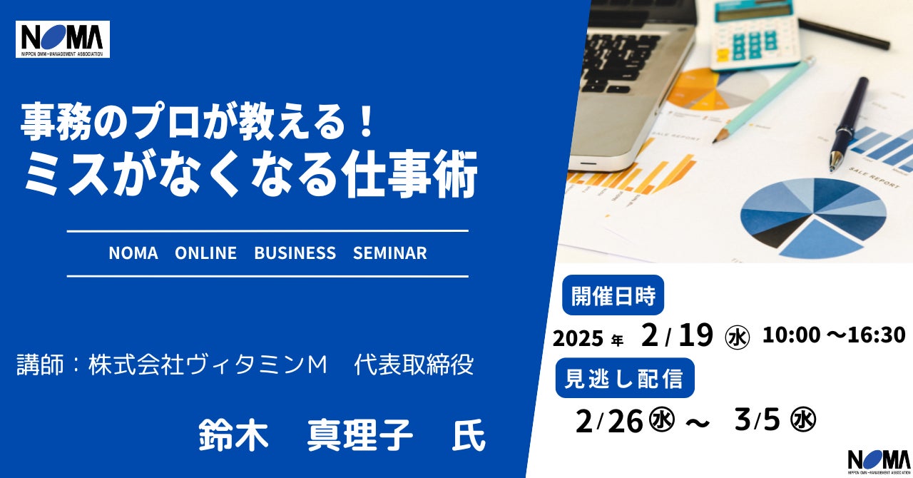 一般社団法人日本経営協会(本部事務局:東京都渋谷区、会長:高原 豪久)は、経営実務講座「事務のプロが教える!ミスがなくなる仕事術」を新規開催いたします。