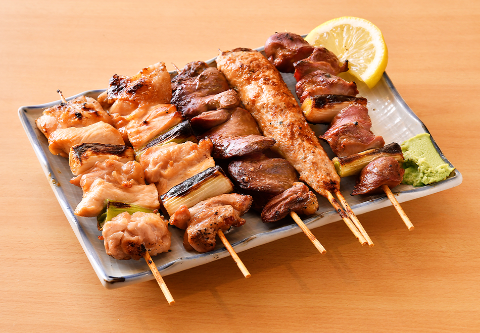 • 焼き鳥 盛り合わせ(3 本):1,200 円(たれ/塩) • 焼き鳥 盛り合わせ(5 本):2,000 円(たれ/塩)