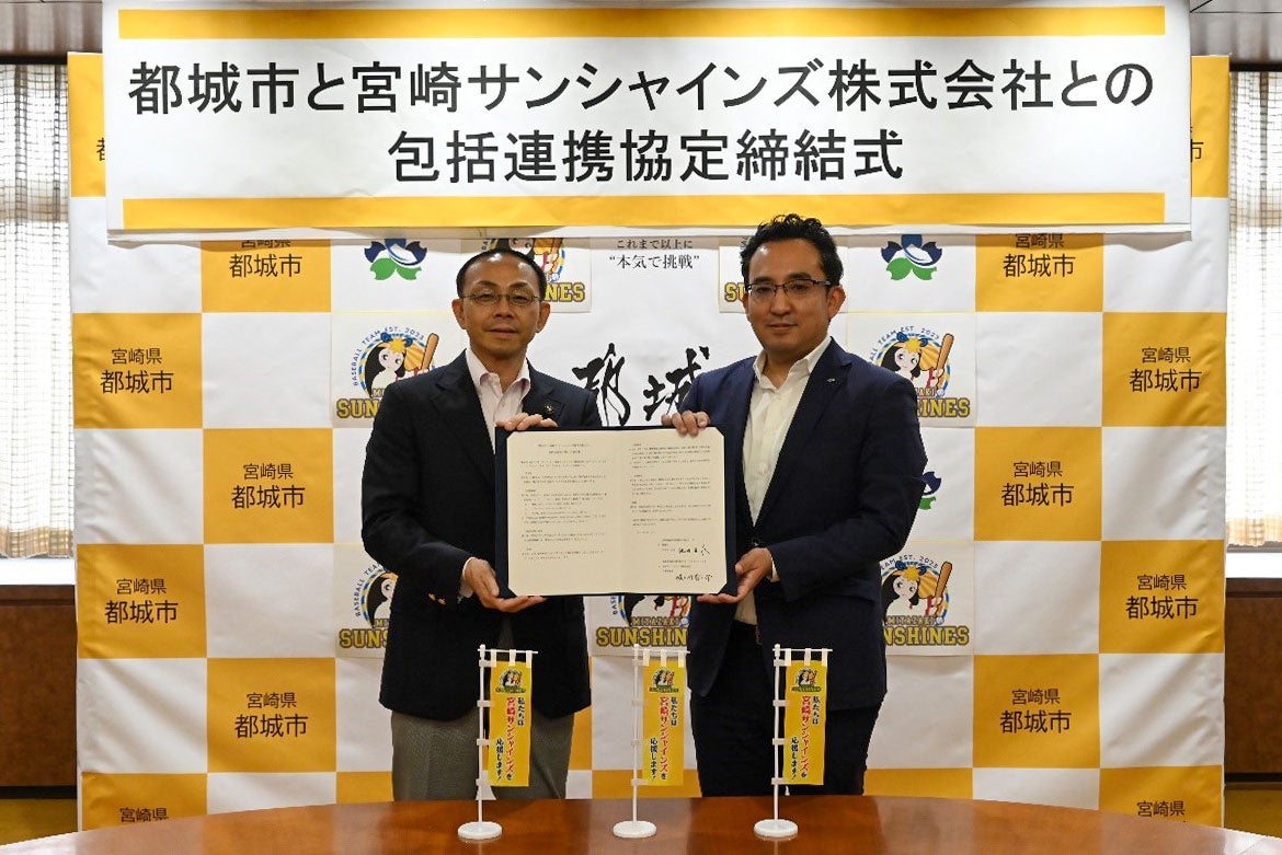 都城市と宮崎サンシャインズ株式会社は、令和7年5月28日㈬、相互に連携し、市民サービスの向上および地域活性化を図ることを目的として、包括連携協定を締結しました。
