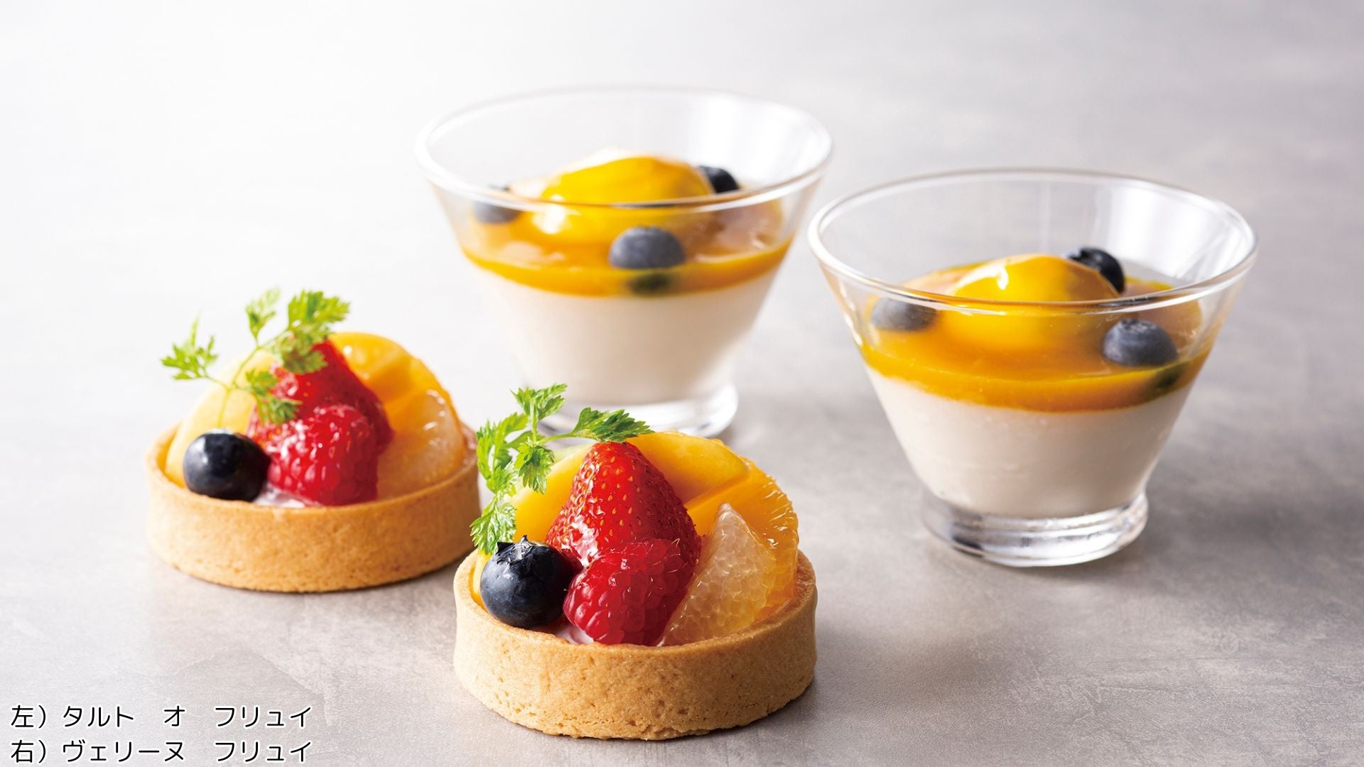 「ヴェリーヌ フリュイ」は、ココナッツミルクと豆乳をブレンドしたまろやかでコクの あるプリンに、大豆とココナッツオイルを主原料としたふわふわのクリームを重ねました。バナナ・パイナップル・マンゴーの甘酸っぱいピューレが夏らしく、爽やかなスイーツに仕上げています。