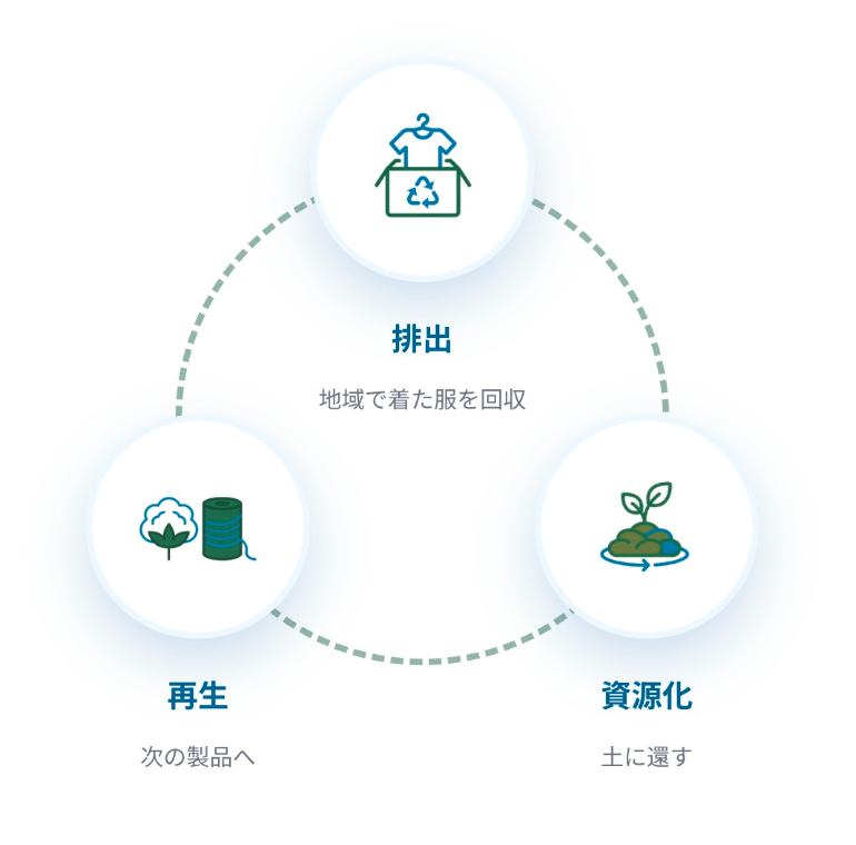 地還(地域での堆肥化): 使用後の衣類を回収し、地域の提携農園で堆肥化します。独自の生分解技術により、衣類を高品質な土へと還元します。