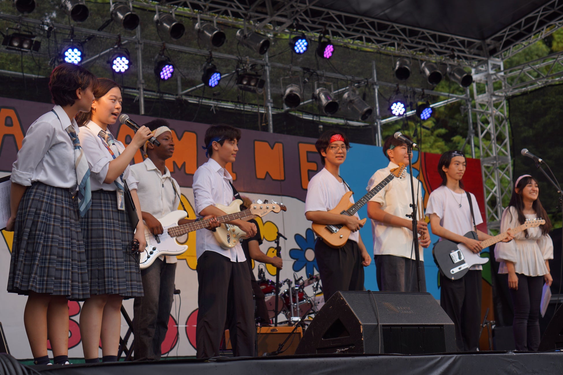 高校1年生はSDGsの認識を広めるための体験型ブースを、2・3年生は創造性に富む模擬店を出店しました。さらに、IB科目の音楽HL(ハイ・レベル)を選択する3年生が60分間の音楽ステージを企画・運営し、全学年から計32名の生徒が多種多様な音楽パフォーマンスを披露しました。
