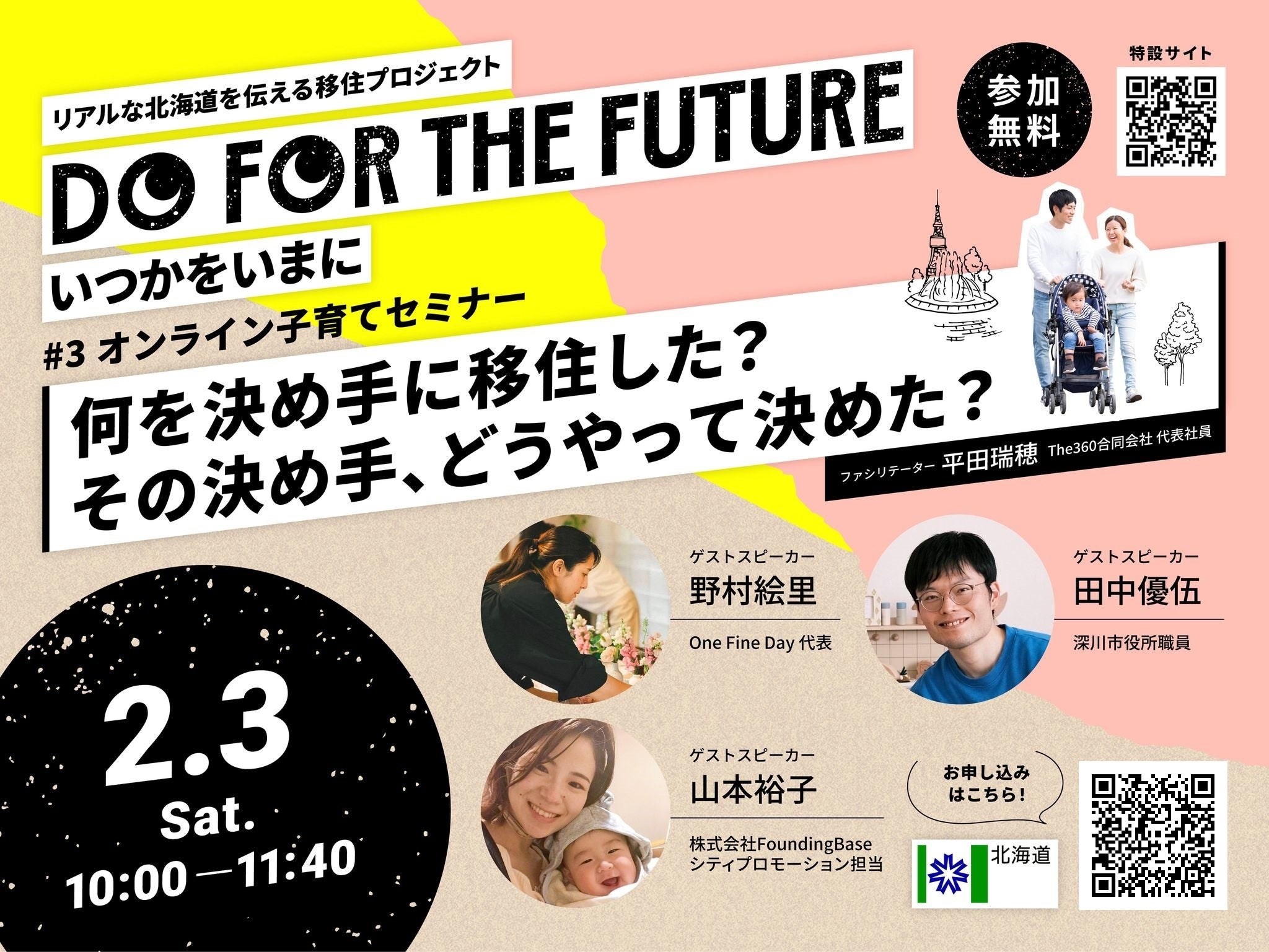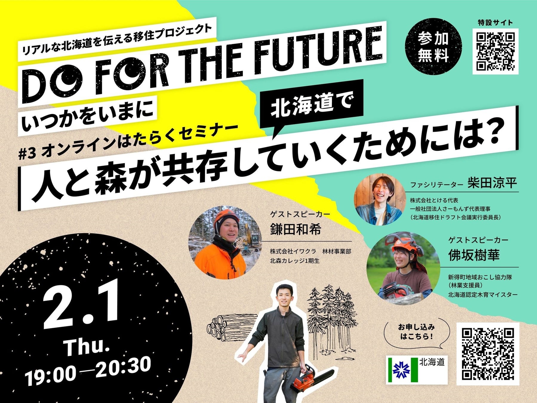 関係人口の拡大や将来的な移住に向けて、北海道に関心を持っていただくため、リアルな北海道を伝える移住プロジェクト「DO FOR THE FUTURE いつかをいまに」オンライン子育て・はたらくセミナー(林業編)を次のとおり開催します。