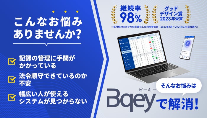 アルコールチェック義務化に対応するため、多くの企業が紙やExcelによる運用を始めましたが、その実施や記録管理に大きな負担を感じているのが現状です。Bqeyを活用することで、以下のようなメリットを得られ、業務負担の軽減と飲酒運転対策の強化を同時に実現できます。