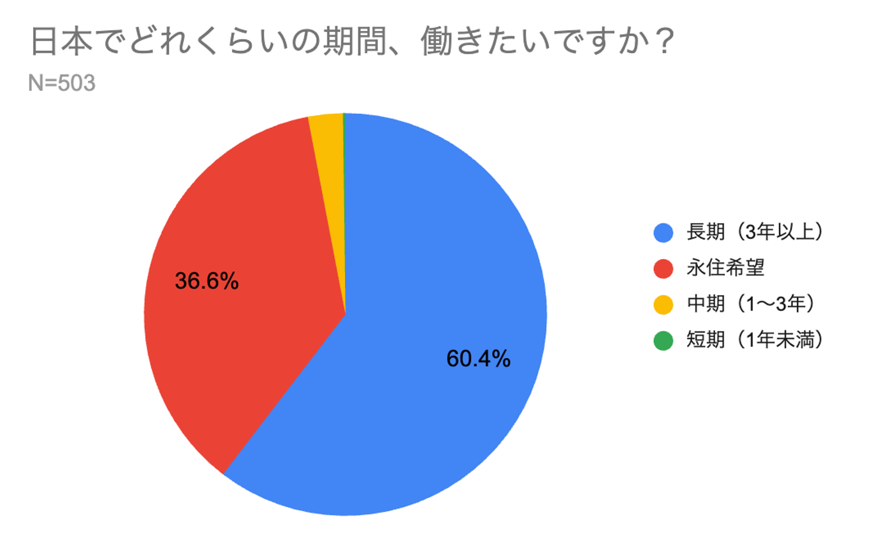 日本で働きたい期間については、「長期(3年以上)」と回答した人が60.4%、「永住希望」が36.6% となり、回答者の97%が長期の就労を希望していることが明らかになりました。一方で、短期(1年未満)や中期(1〜3年)を希望する人は合わせて3%に満たず、日本での就労を一時的な経験として捉える層はごく少数にとどまっています。これらの結果から、日本は「短期間働く場所」ではなく、長期的なキャリア形成や生活の基盤を築く国として選ばれている実態がうかがえます。