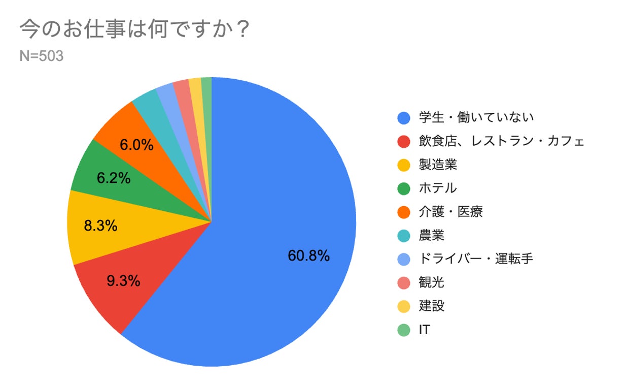 現在の職業について、「学生・働いていない」と回答した人が60.8%と最も多く、今回の回答者の多くが「これから就労を希望する層」であることが明らかになりました。一方、現在就労している層では、飲食店・レストラン・カフェ9.3%、製造業8.3%、ホテル6.2%、介護・医療6.0%が中心でサービス業・製造業に分布が集中している傾向が見られました。そのほか、農業3.0%、ドライバー2.0%、観光1.8%、建設1.4%、IT1.2%など回答があり、求職者の職歴は幅広い業種であることがうかがえます。