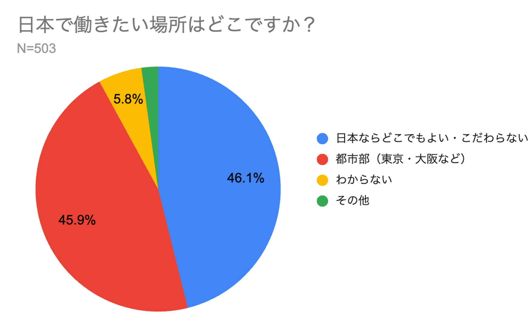 また、勤務地に関しては、都市部を希望する回答と「日本国内であれば場所を問わない」とする柔軟な志向がほぼ同程度となりました。この結果は、就労先が大都市に限定されることなく、全国各地へ広がる可能性を示しています。