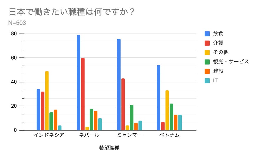 希望職種では、飲食業や介護分野といったサービス業が上位を占めており、日本という慣れない環境においても、就労のイメージを持ちやすく、比較的働き始めやすい職種が選ばれている傾向がうかがえます。