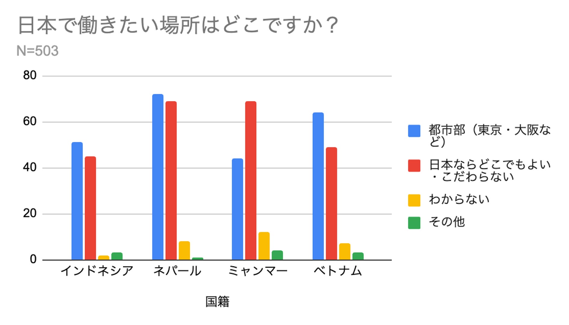回答数:503名(インドネシア101人、ネパール150人、ミャンマー129人、ベトナム123人)