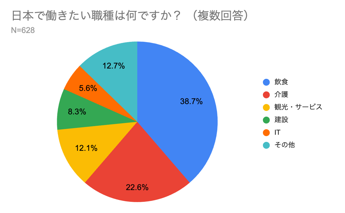 日本で働きたい職種について、最も人気が高かったのは「飲食」38.7% で、全体の約4割が飲食業を希望していることが分かりました。飲食業は未経験から挑戦しやすく、外国人材の受け入れも進んでいることから、志望が集中する傾向がみられます。